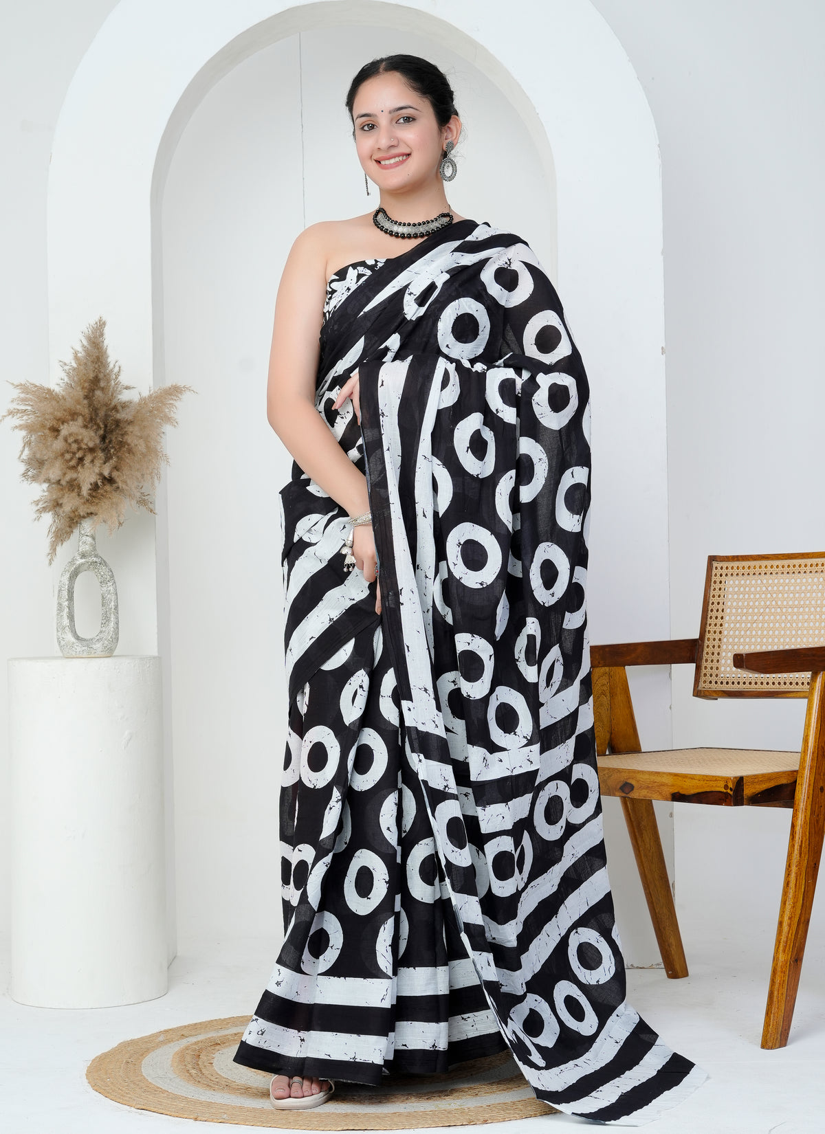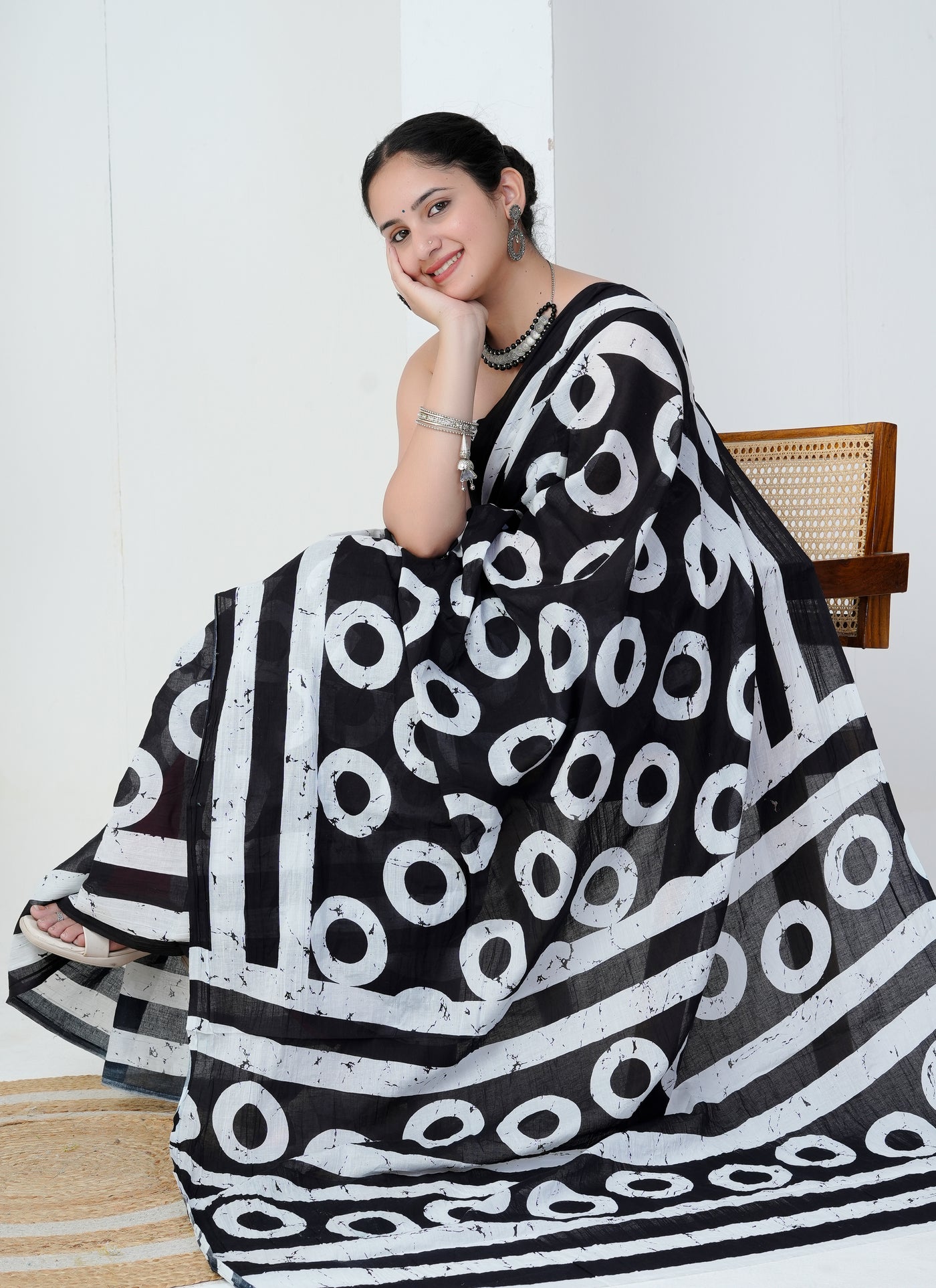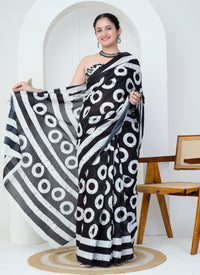 Command attention with this contemporary black cotton saree featuring bold circular white prints arranged in rhythmic patterns across the drape. The pallu showcases a striking play of concentric rings and stripes, adding a graphic edge to your ethnic wardrobe.