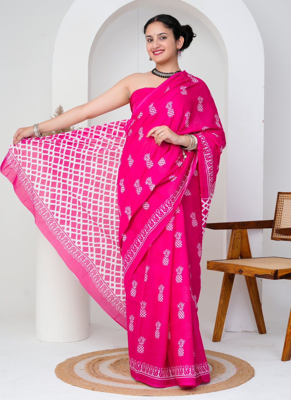 Add a fruity twist to your ethnic wardrobe with this delightful cotton saree in bright pink, adorned with playful white pineapple prints across the body and a contrasting checked pallu. It's the perfect combination of tradition and fun — ideal for women who love bold colors and cheerful patterns.