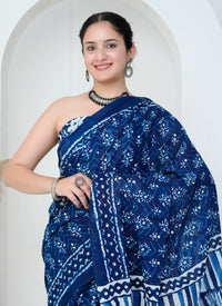 Step into effortless style with this indigo blue cotton saree adorned with delicate white leafy chevron prints all over the body. The pallu contrasts beautifully with vertical blocks of foliage and traditional stripes, giving it a harmonious balance of nature-inspired artistry and geometric rhythm.