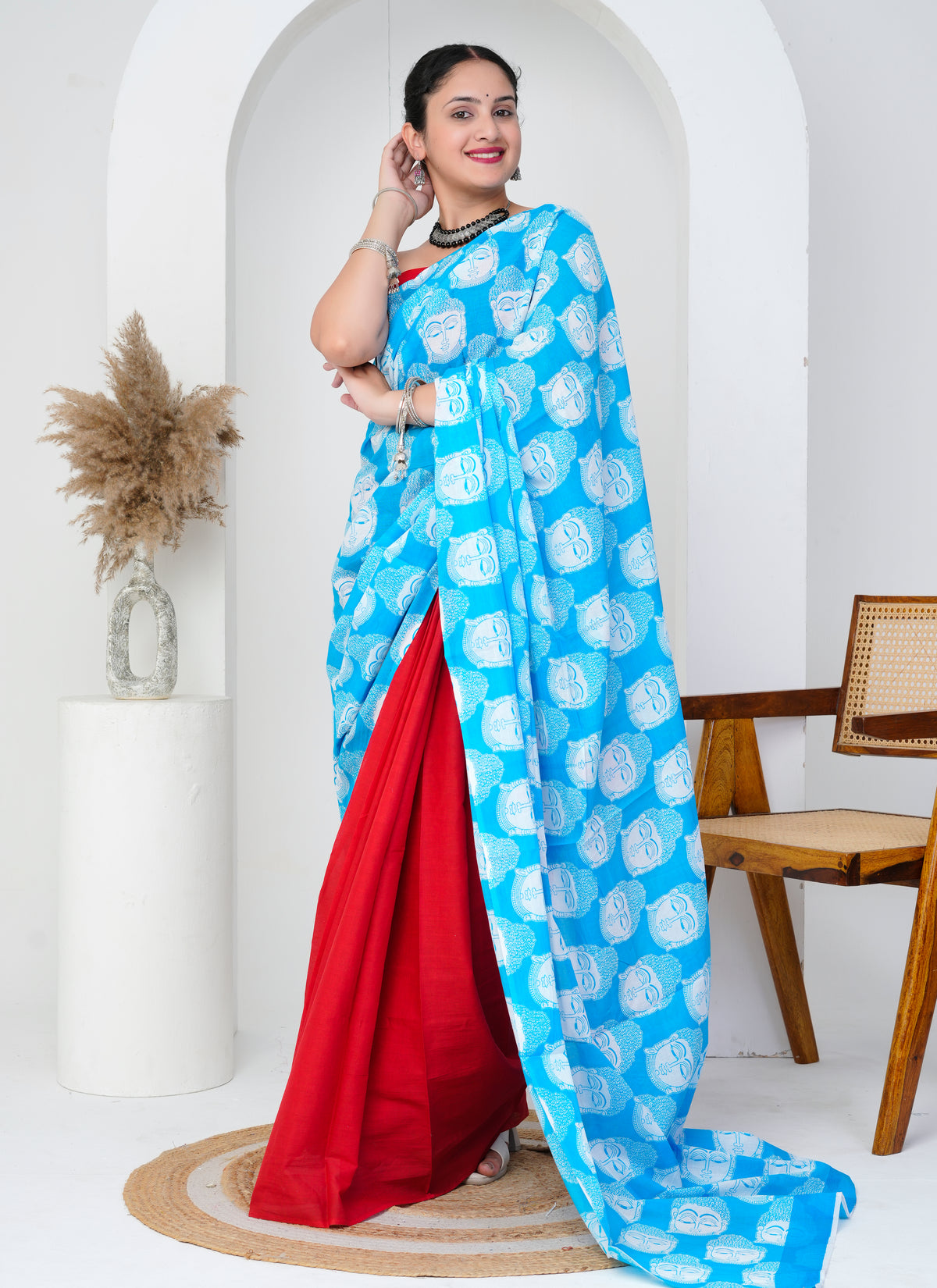 Radiate tranquility and style with this serene cotton saree featuring a bold red base and a sky-blue pallu adorned with repeated Buddha face prints. Symbolizing peace, mindfulness, and inner strength, this saree is perfect for those who love to wear their values with pride.