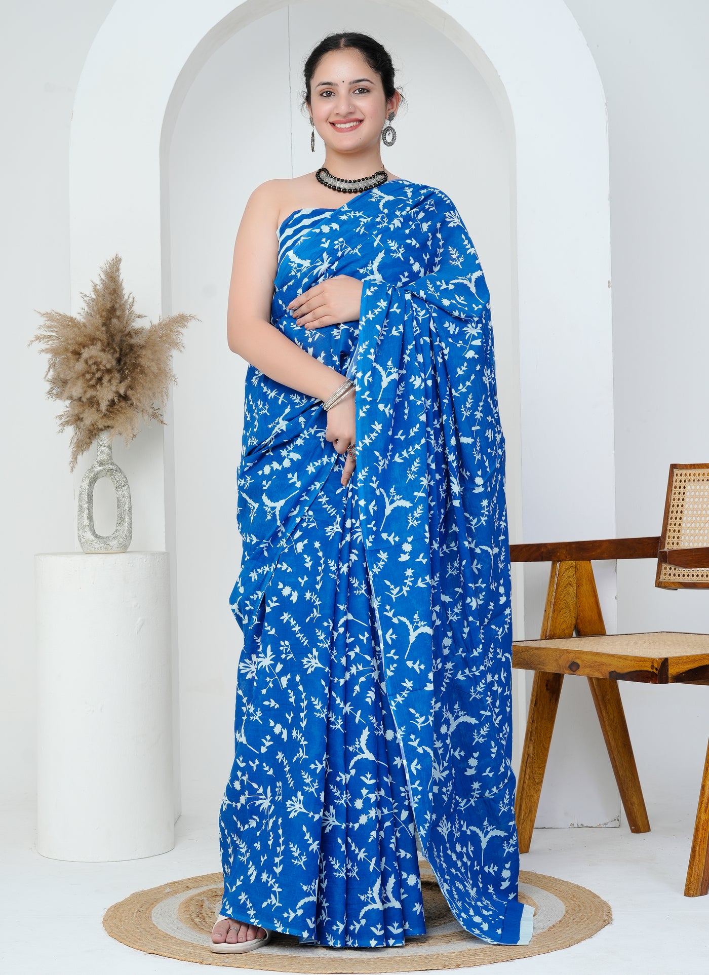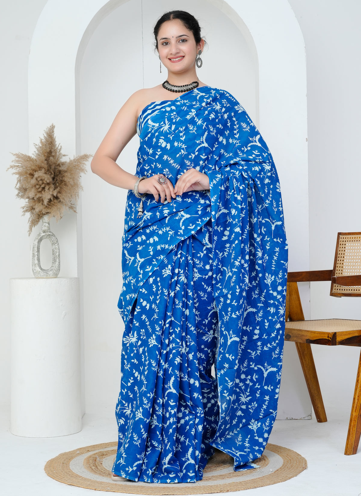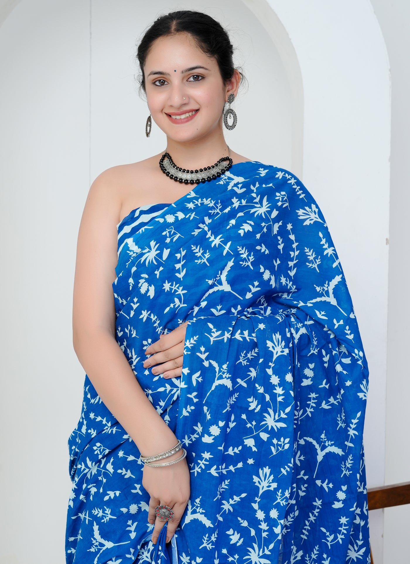 🌿 Color: Deep royal blue body with light blue pallu and white botanical prints