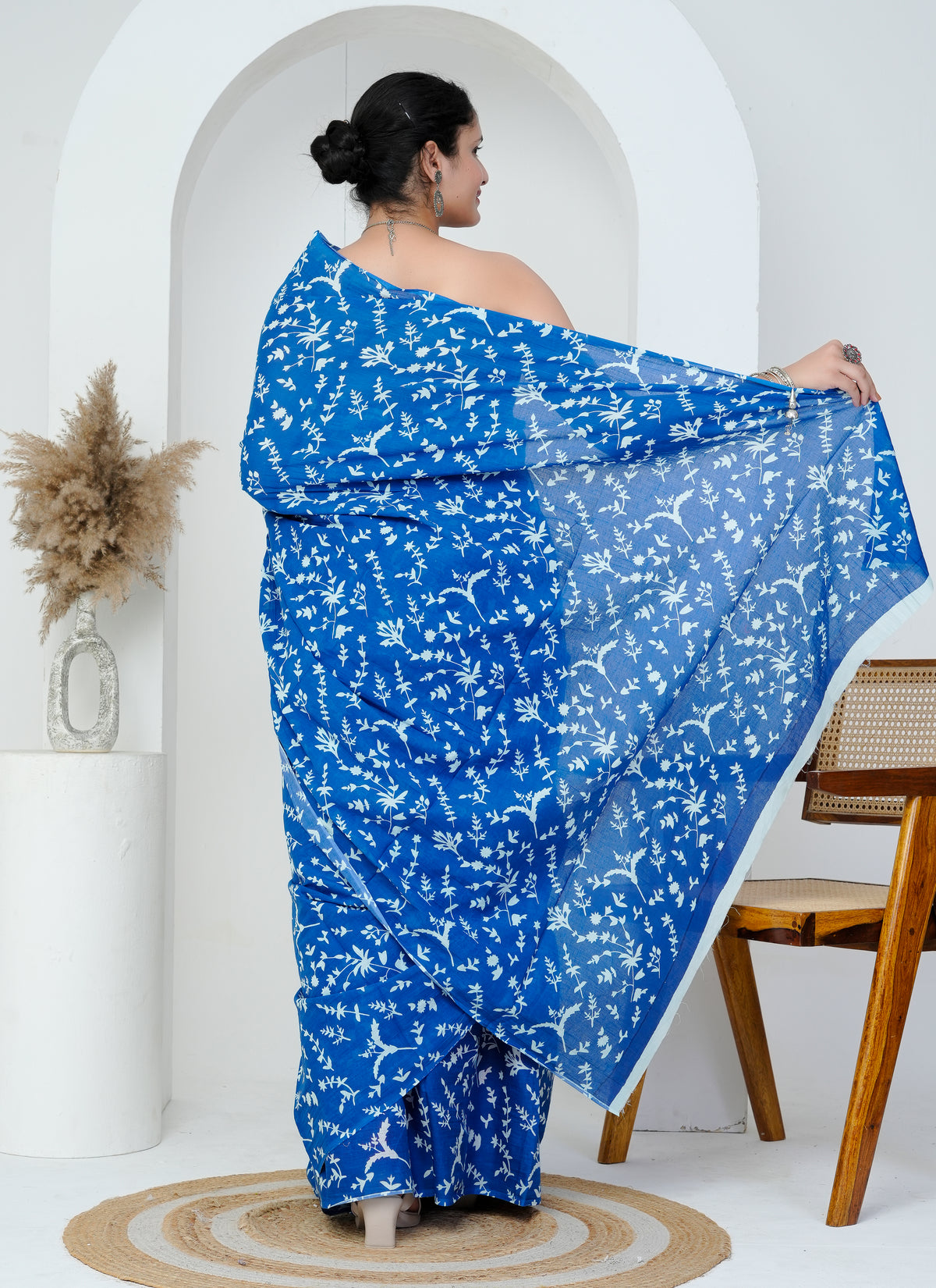 Celebrate the art of slow fashion with this soothing royal blue cotton saree, delicately hand-block printed with a white botanical design. The airy vine and floral motifs bring a sense of calm and freshness, while the soft cotton fabric promises all-day comfort. The dual-tone pallu in light and deep blue adds depth and character to this effortlessly graceful drape.