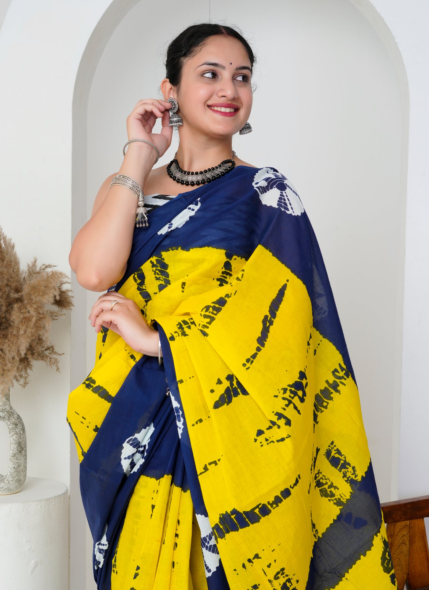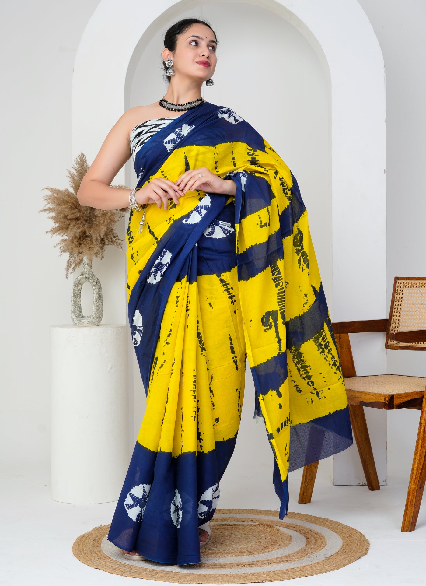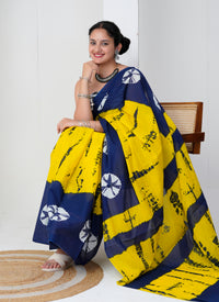Bring out your creative flair with this bold cotton saree featuring a striking combination of sunshine yellow and deep navy blue. Designed with abstract tie-dye effects and circular handblock motifs, this saree exudes a modern ethnic appeal perfect for women who love to stand out.