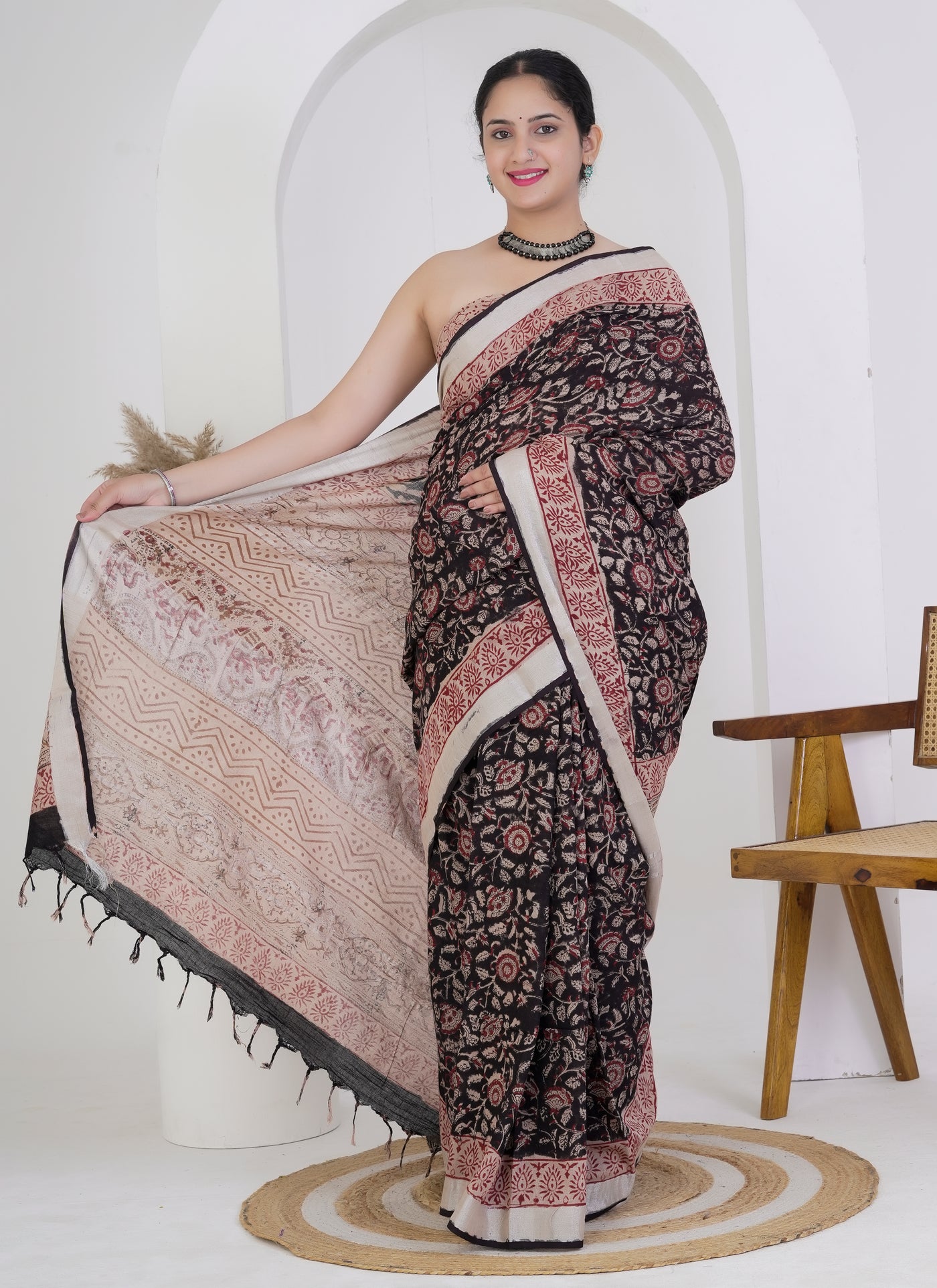 Black and Beige Floral Motif Pure Linen Saree with Traditional Pallu