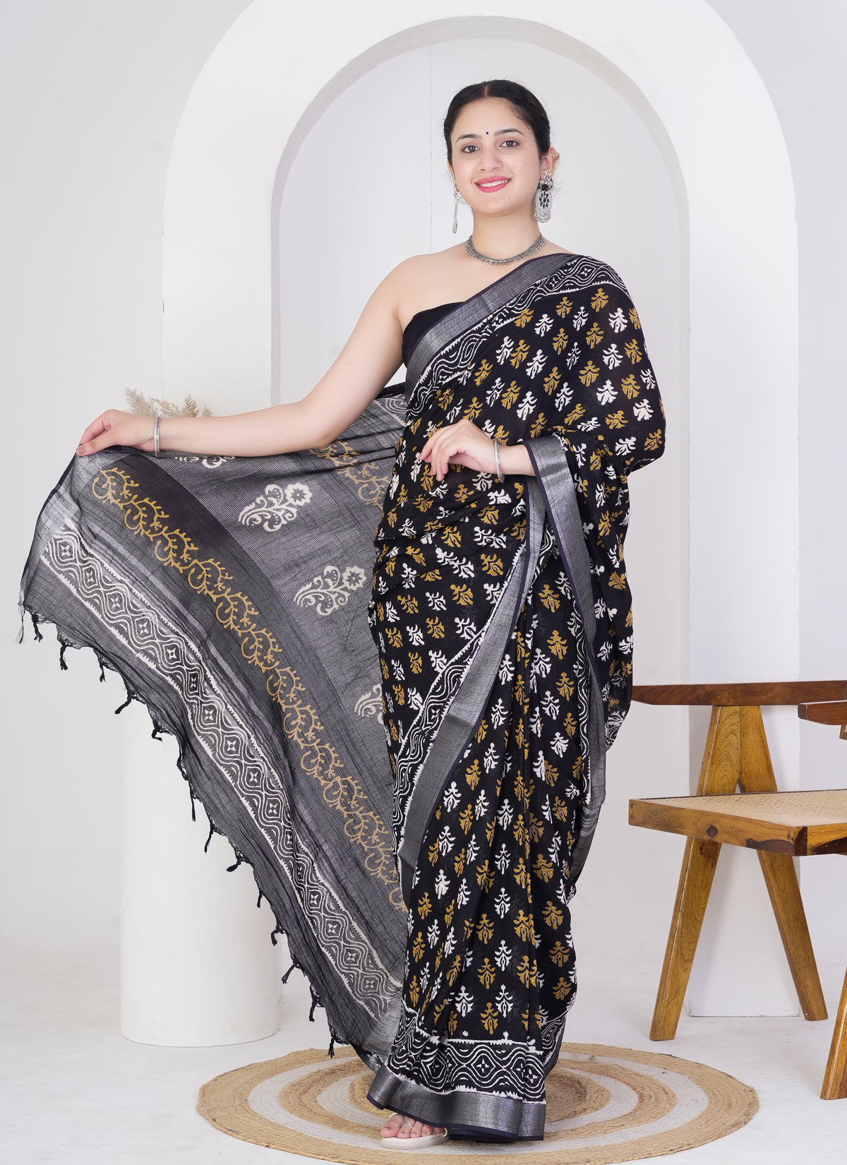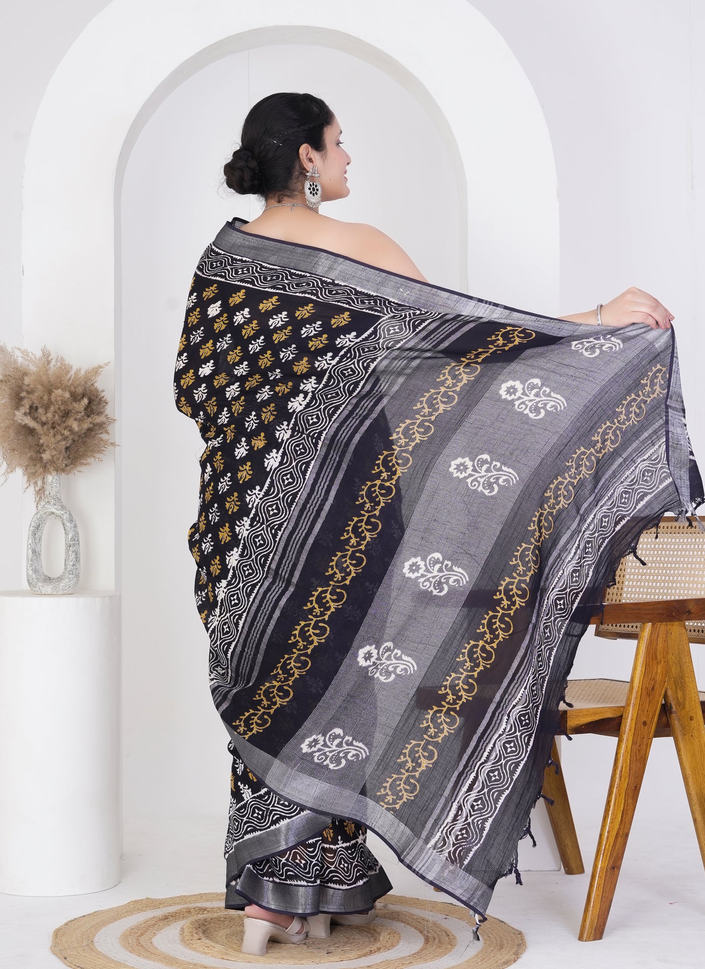 Step into timeless sophistication with this black pure linen saree, featuring charming mustard and white floral block prints that add a subtle vibrance to your look. Crafted from 100% pure linen, this saree is airy, soft, and perfect for both festive occasions and everyday elegance.