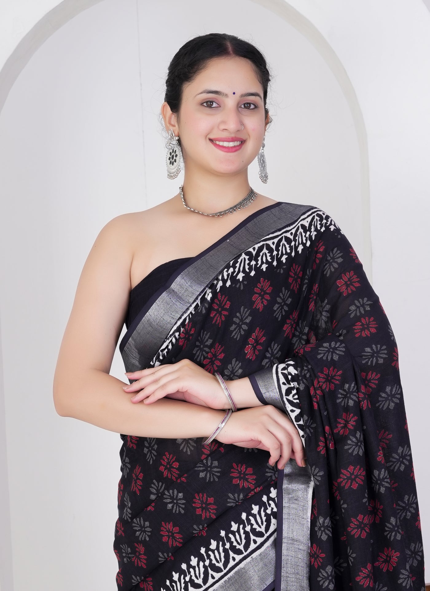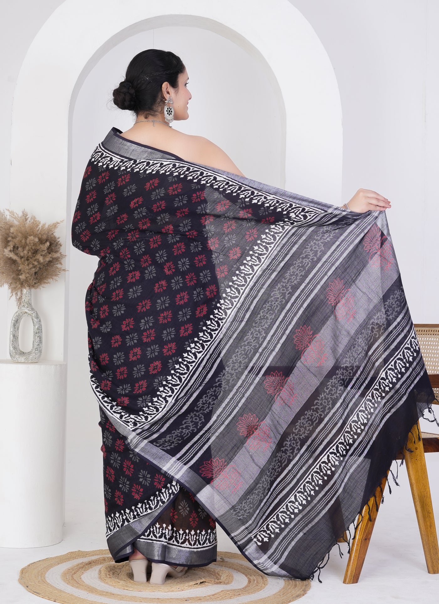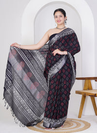 Channel classic elegance with a bold twist in this stunning black pure linen saree, adorned with red and grey floral block prints that exude timeless charm. Handcrafted from 100% pure linen, this saree is soft, breathable, and perfect for both formal occasions and everyday grace.