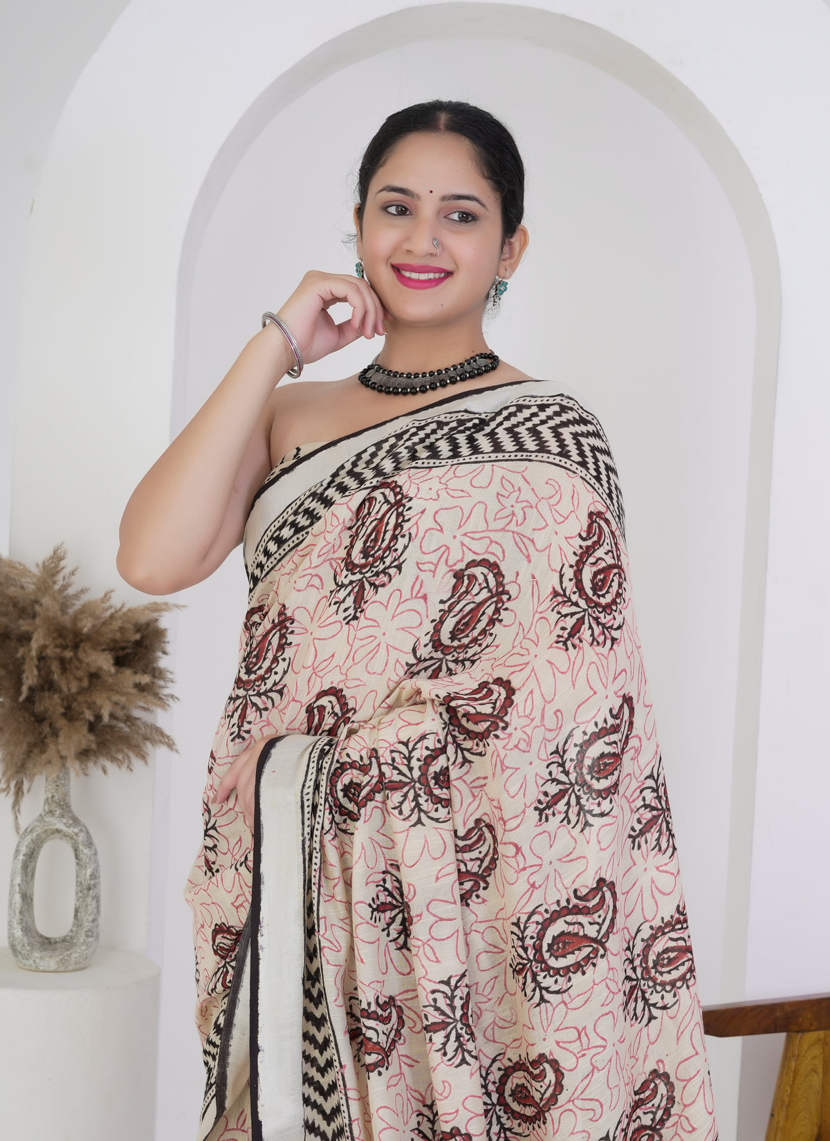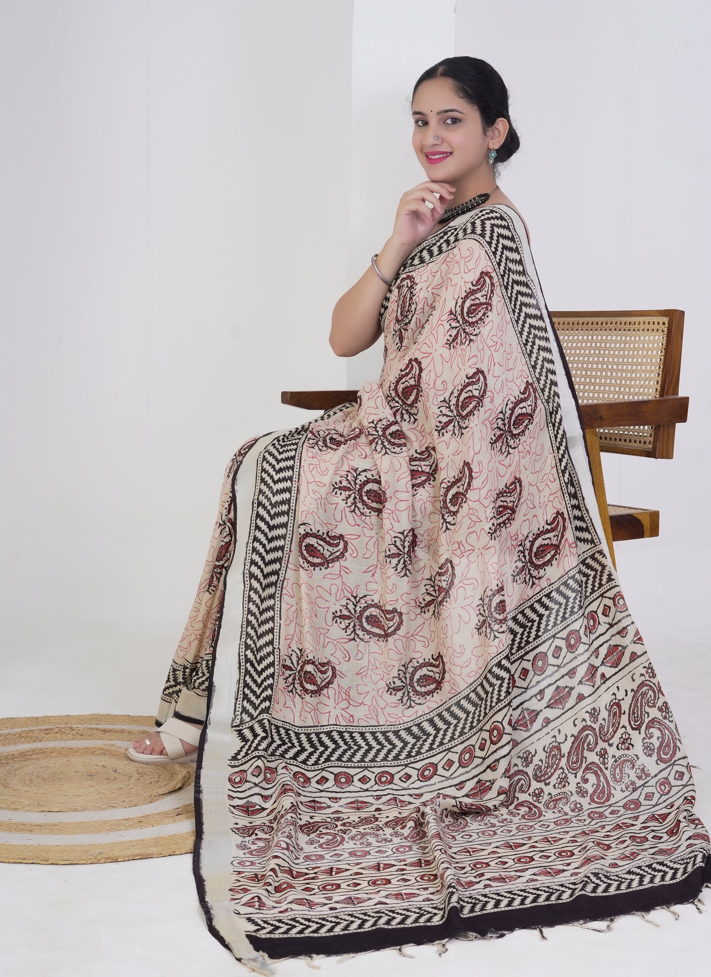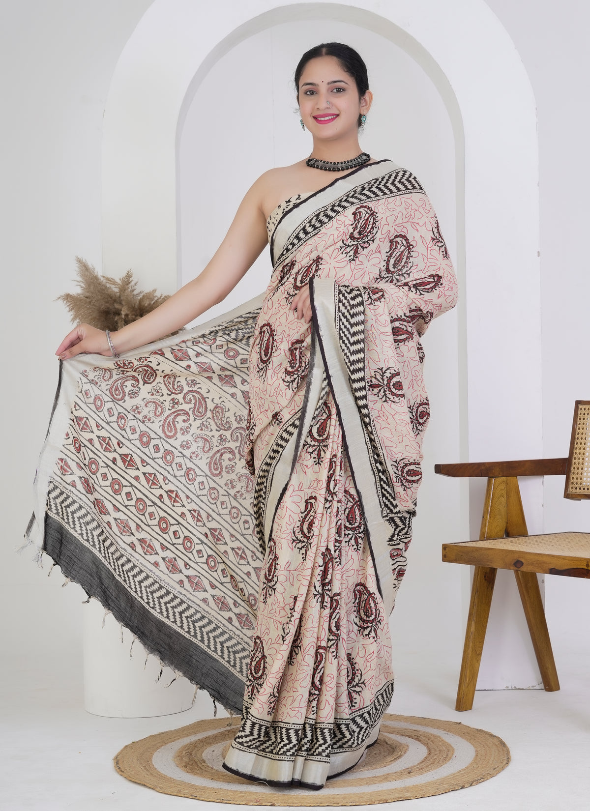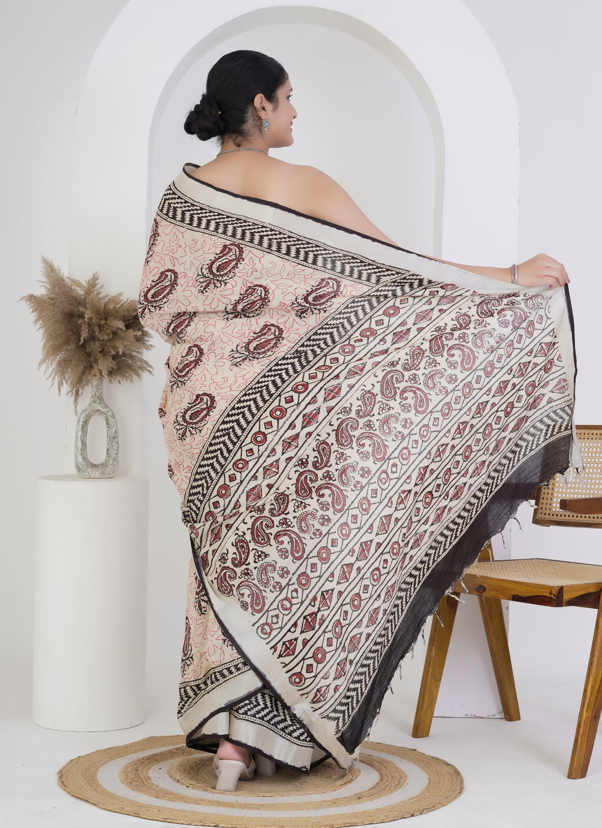 Blush Beige Pure Linen Saree with Maroon Paisley Block Prints and Ornate Ivory Pallu