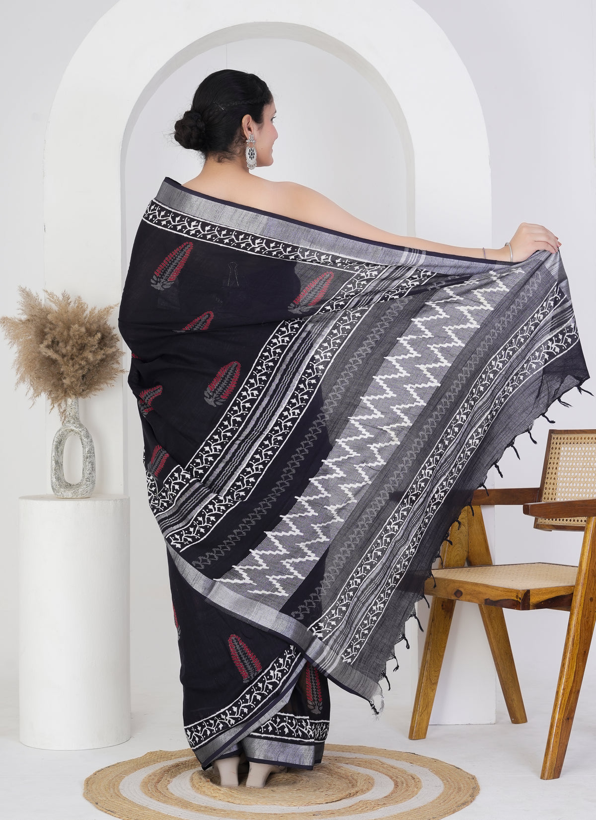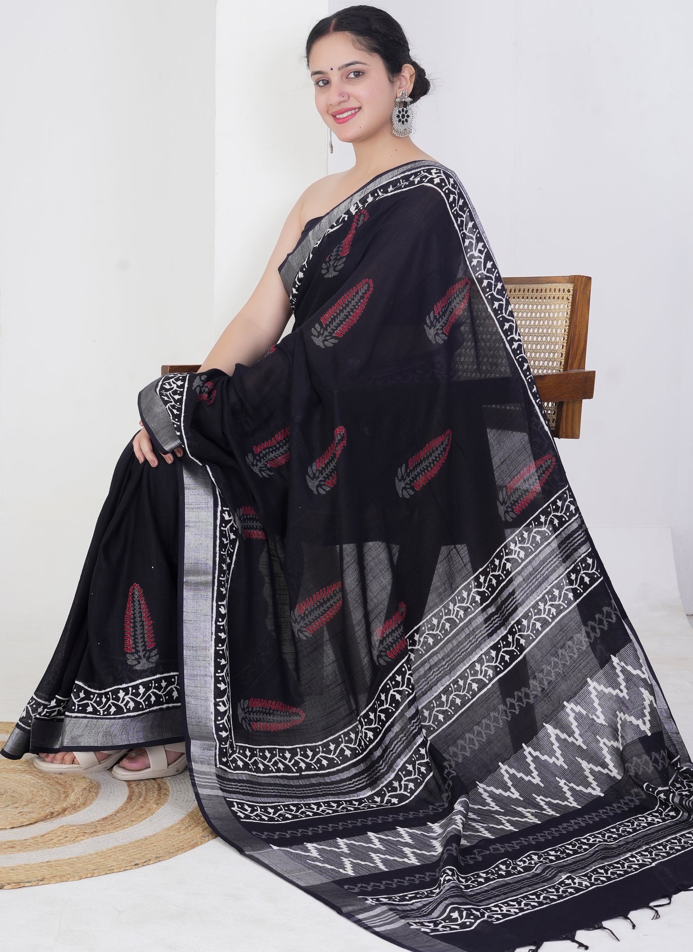 Elegant Black Pure Linen Saree with Woven Pallu and Traditional Motifs