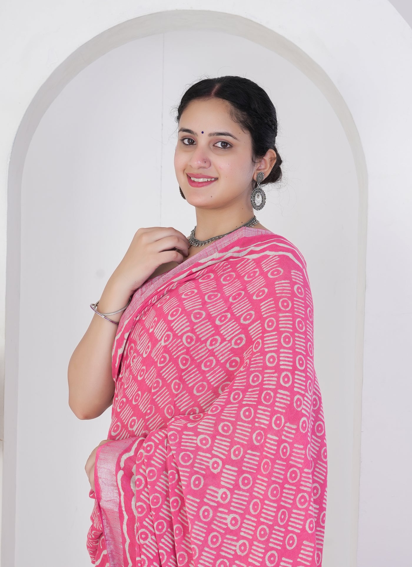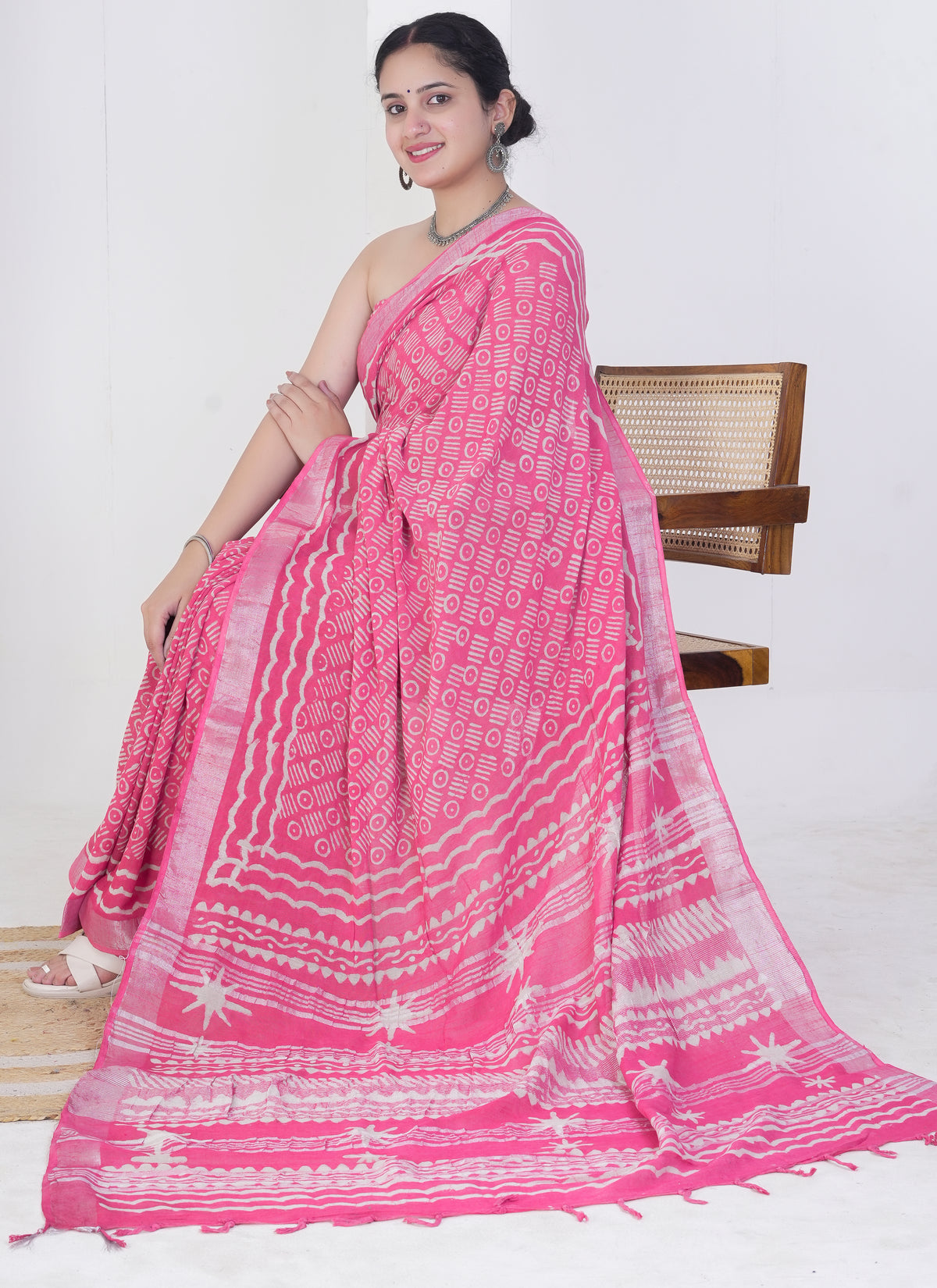 Bold, bright, and unapologetically beautiful—this hot pink pure linen saree is a celebration of handcrafted charm and vibrant energy. Hand block printed with whimsical geometric patterns across the body and a dazzling pallu adorned with star-like motifs, this saree brings a playful edge to timeless tradition.