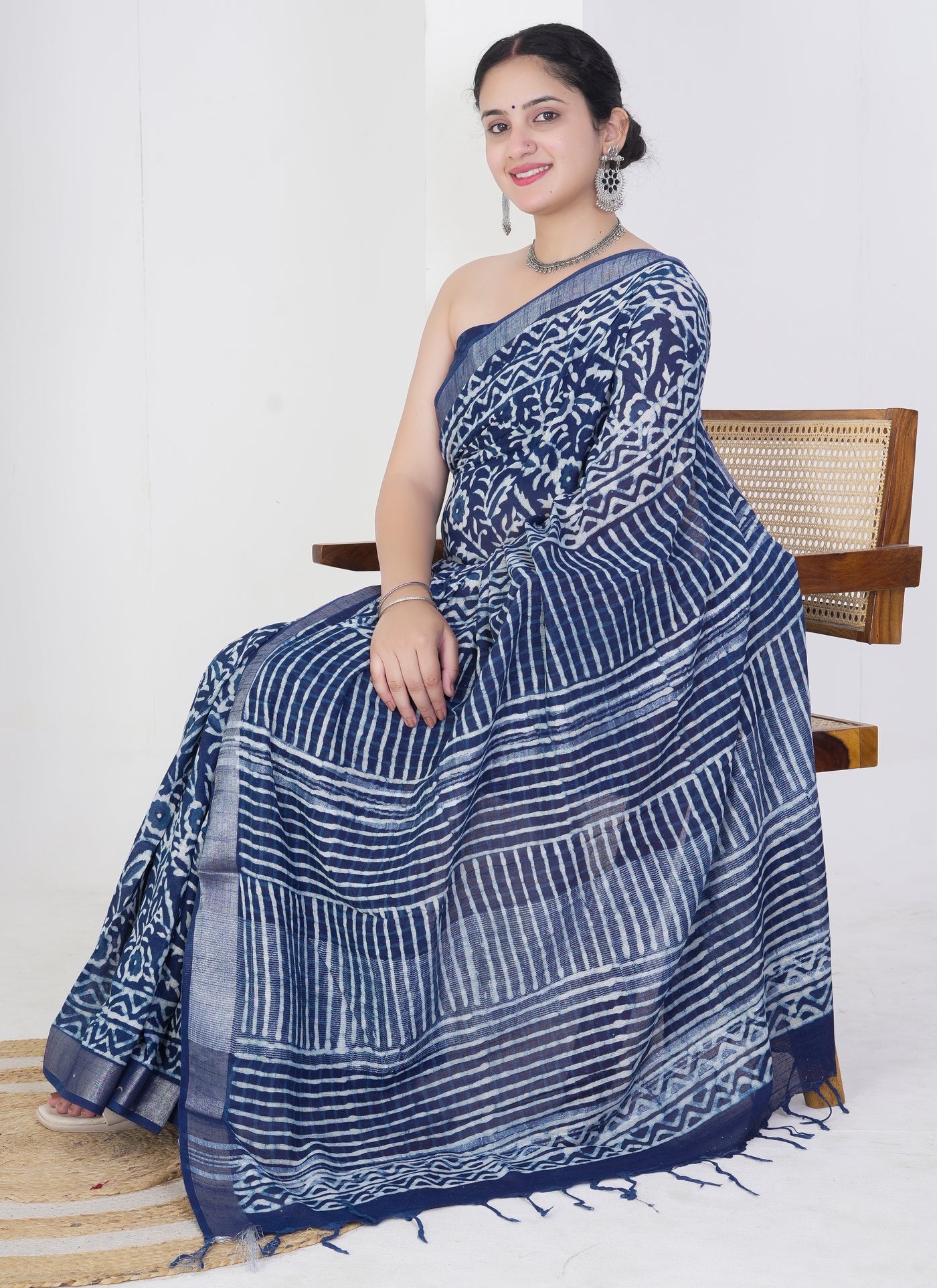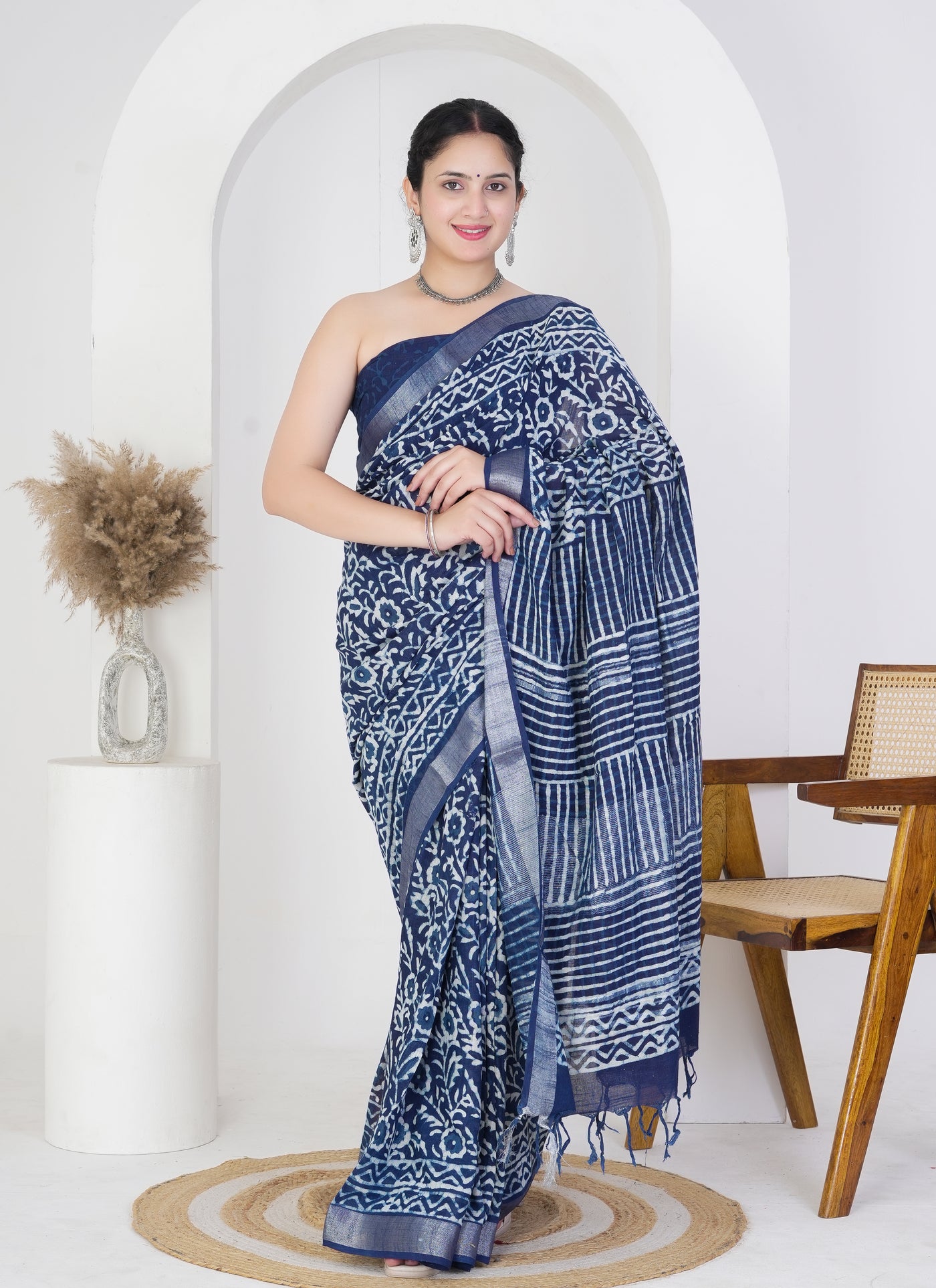 Drape yourself in the cool elegance of this indigo blue pure linen saree, featuring intricate floral and geometric hand block prints for a look that’s both timeless and versatile. Made from 100% pure linen, this saree offers superior breathability, softness, and an easy drape—perfect for warm-weather occasions or everyday elegance.