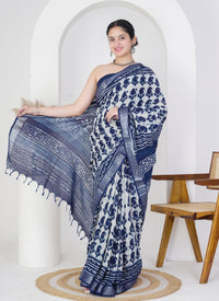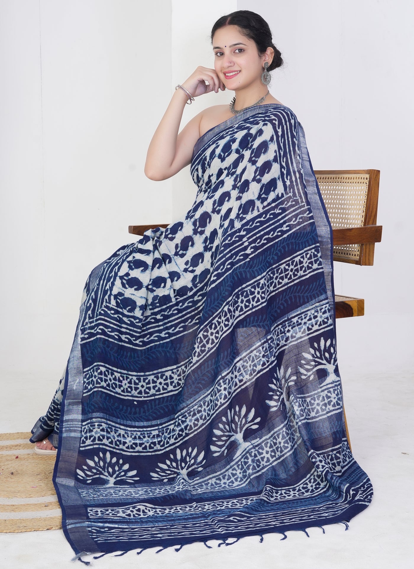 Ivory and Indigo Pure Linen Saree with Bold Floral Block Prints and Striped Pallu