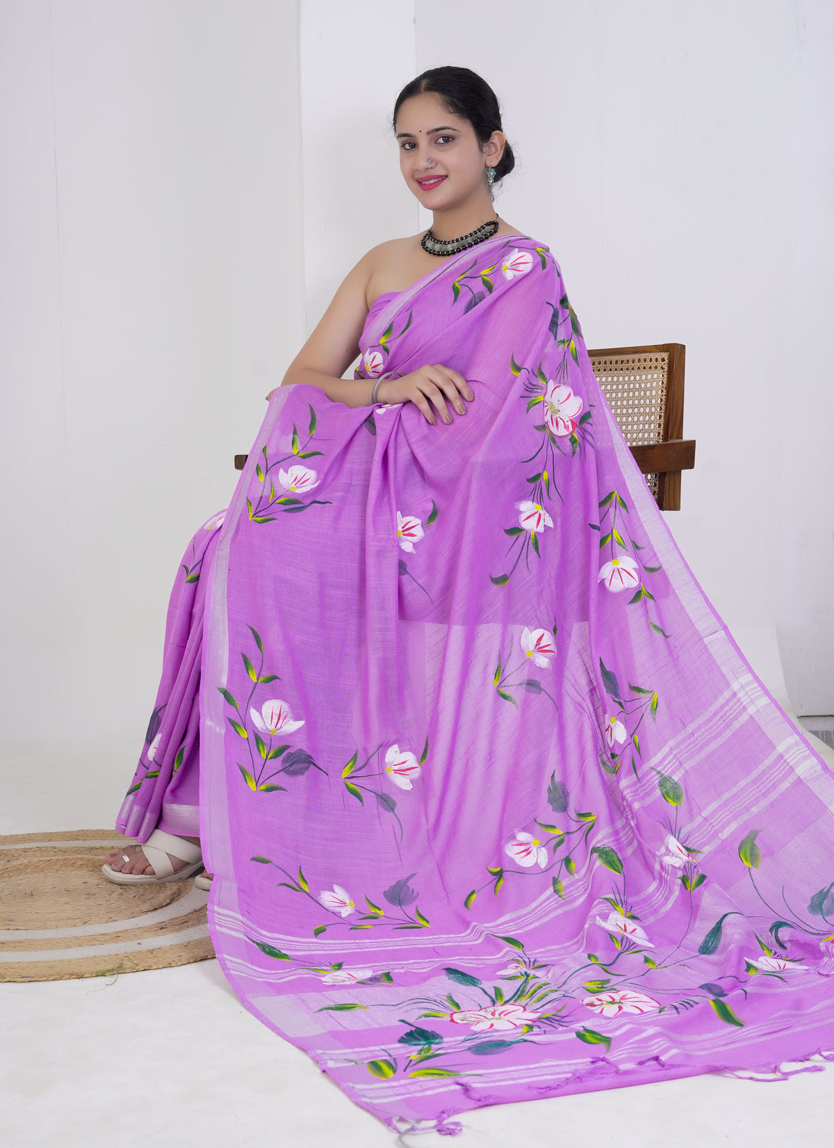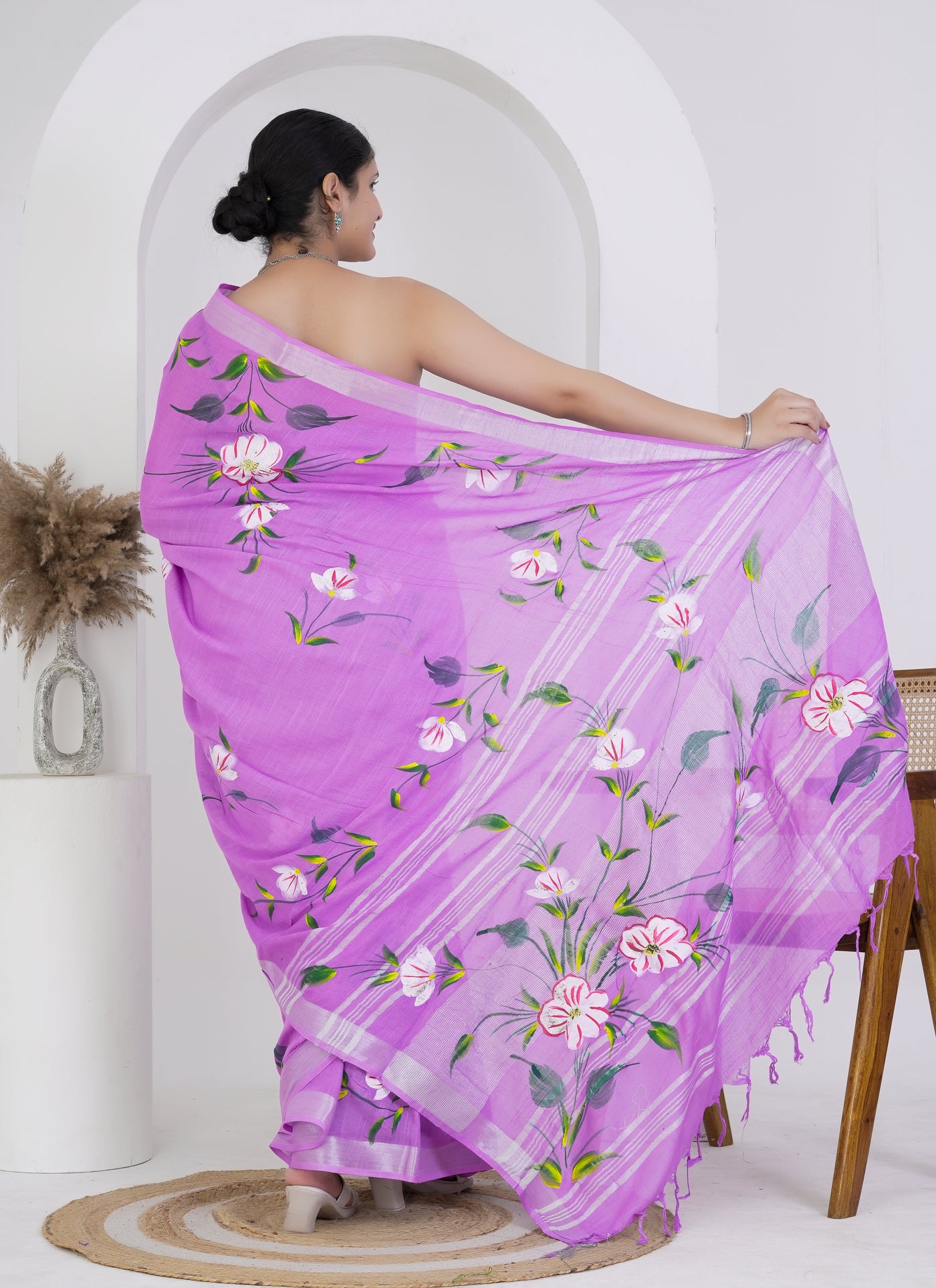 Lavender Pure Linen Saree with Hand Painted White Floral Motifs and Striped Pallu
