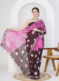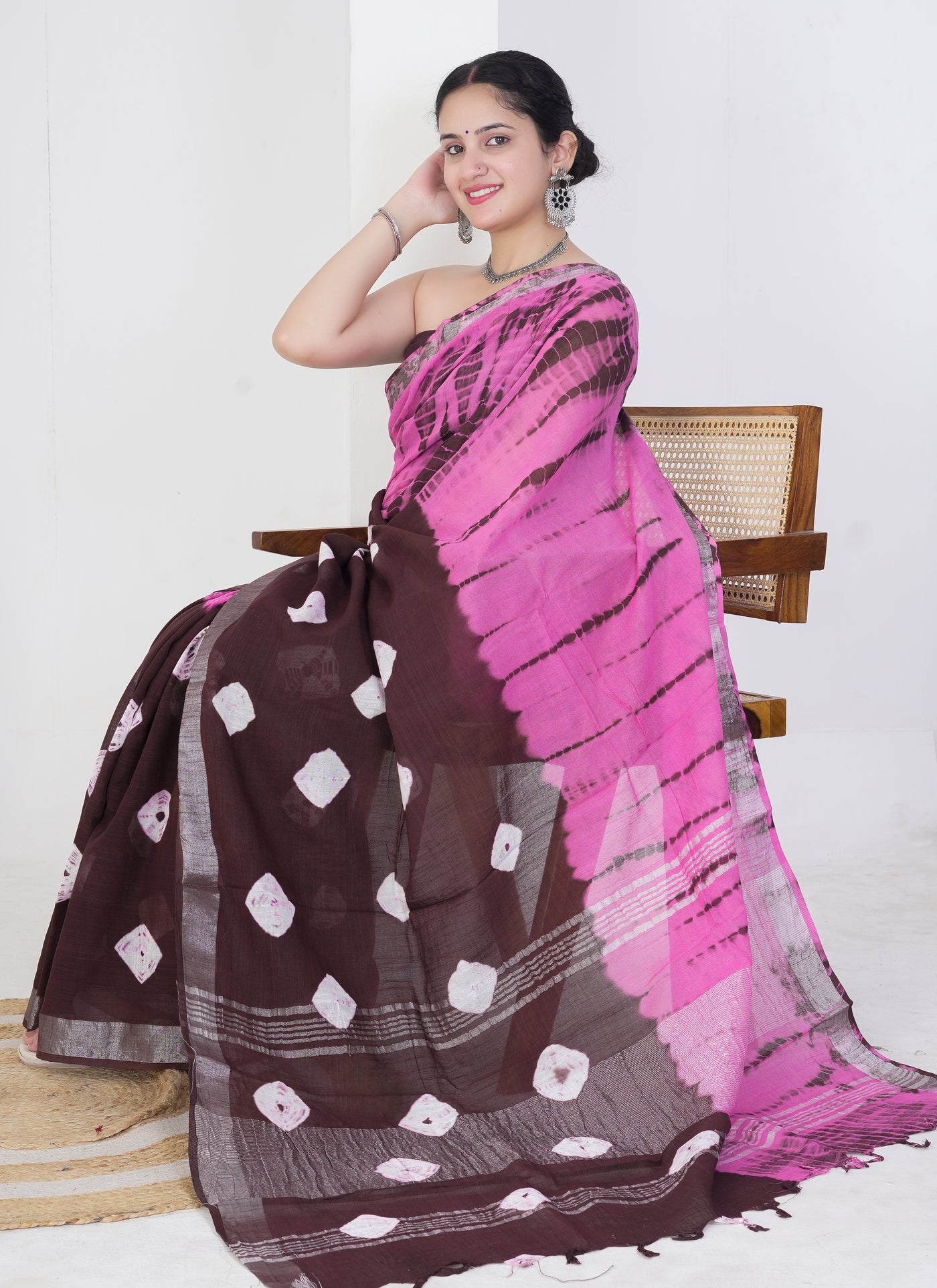 Maroon and Pink Pure Linen Saree with Handcrafted Tie-Dye Design and Silver Border