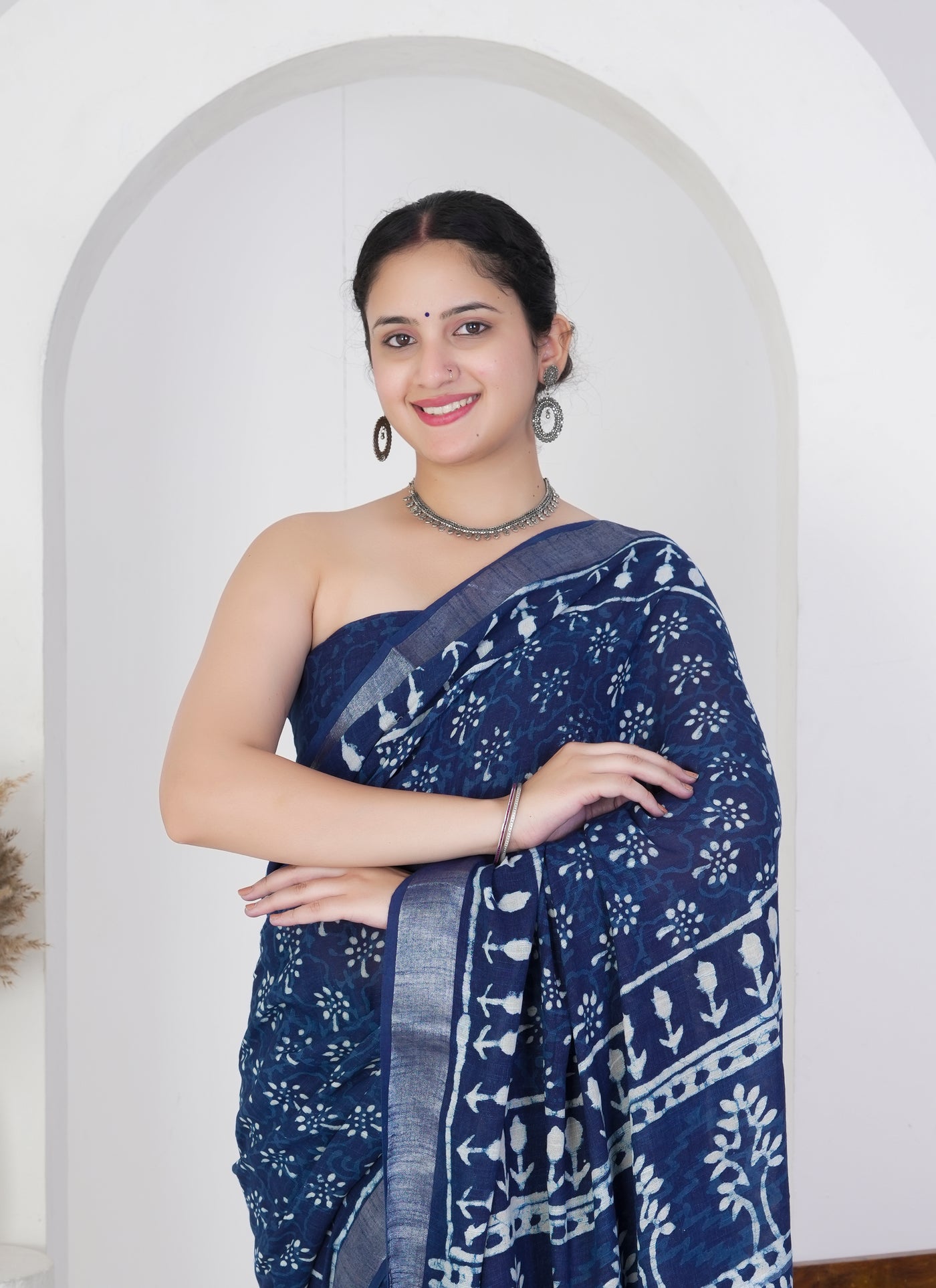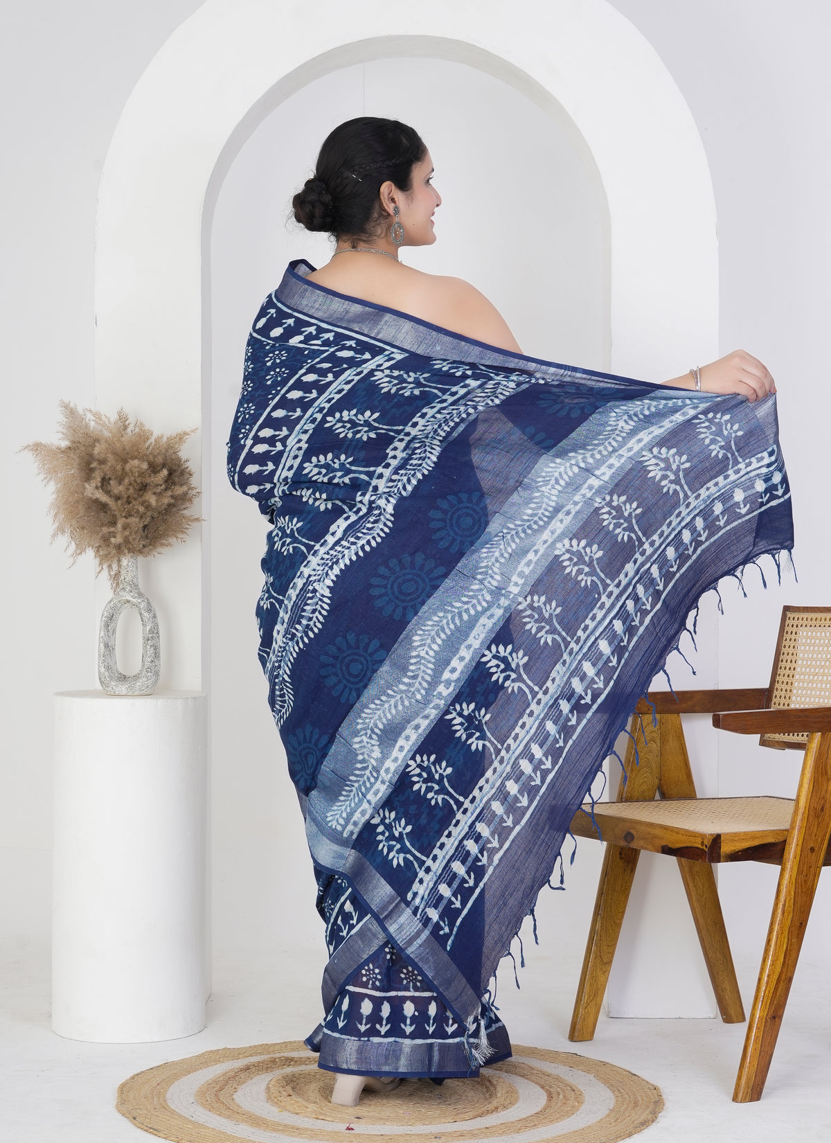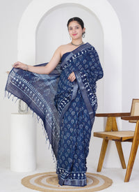 Embrace timeless charm with this midnight blue pure linen saree, adorned in delicate hand block printed floral motifs. The soft white patterns beautifully contrast against the rich indigo base, creating a graceful and earthy appeal perfect for both casual and semi-formal occasions.