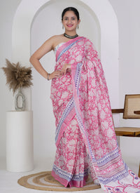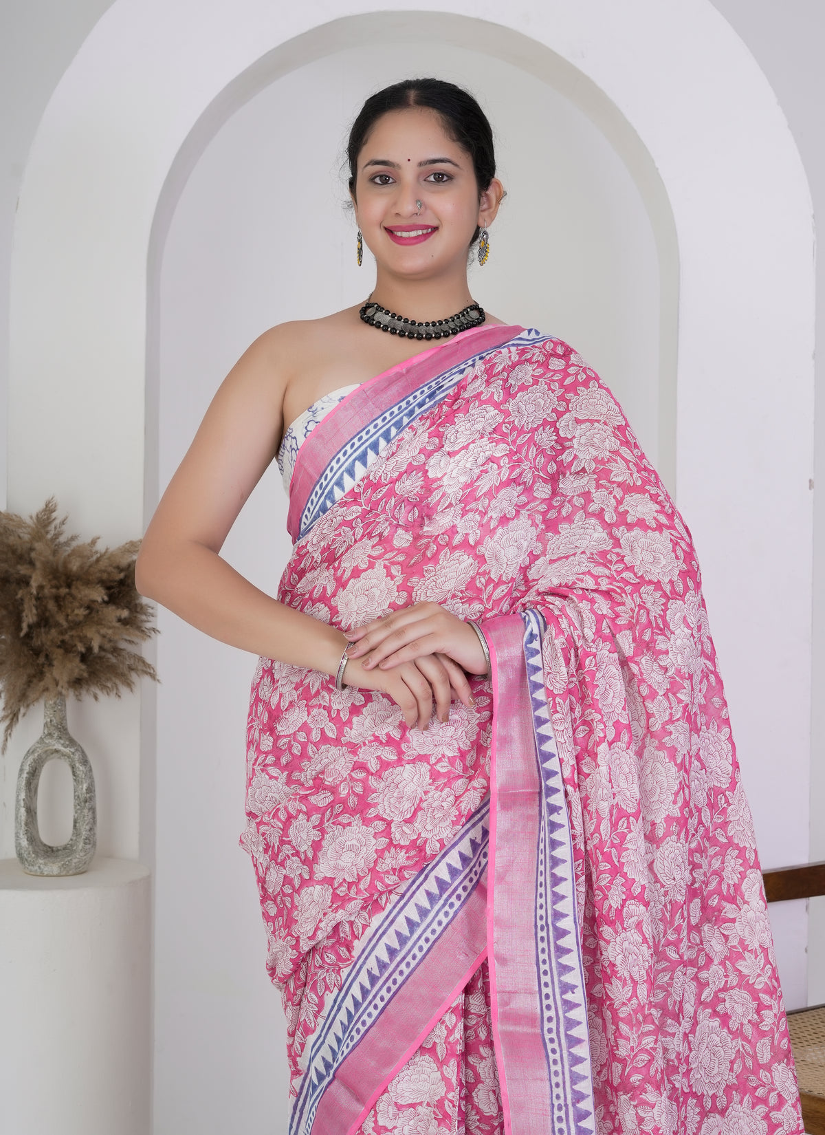 Bask in the freshness of blooming florals with this vibrant pink pure linen saree, featuring delicate white rose motifs printed by hand using traditional block techniques. The saree offers a refreshing and feminine charm, perfect for both casual outings and graceful celebrations.