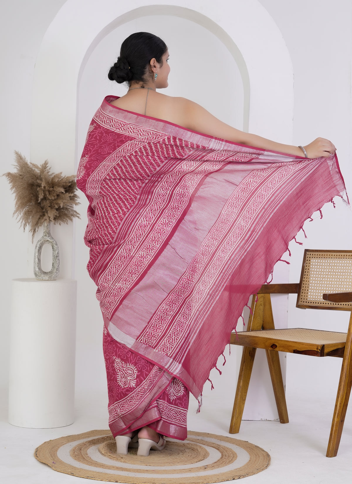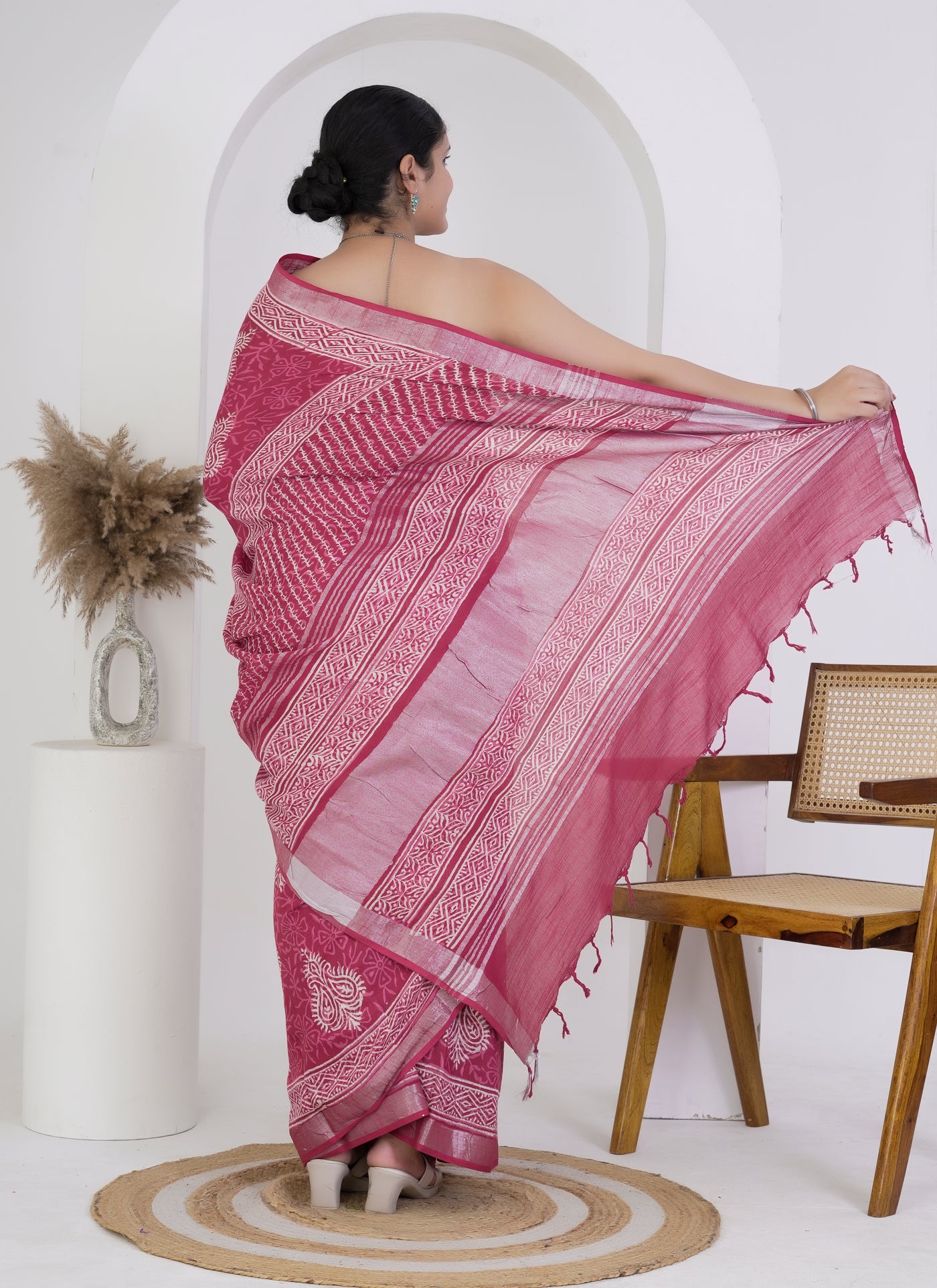 Radiate charm and tradition in this rani pink pure linen saree, hand block printed with elegant white paisley motifs that add a timeless appeal. The rich magenta-pink hue sets a vibrant foundation for the intricate floral and paisley design, exuding grace and femininity.