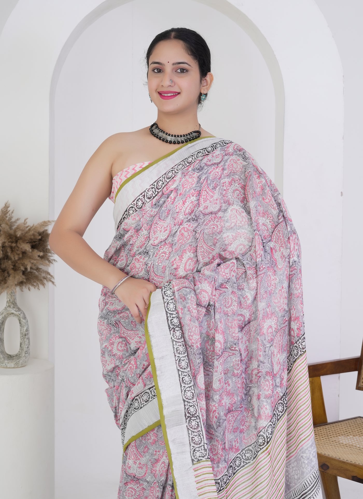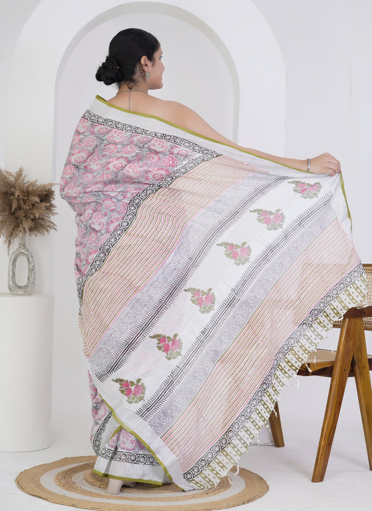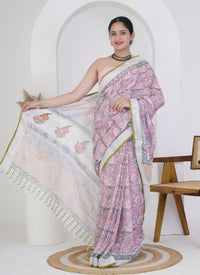 Make a delicate and refined impression in this soft pink and grey pure linen saree, featuring intricate hand block printed paisley motifs that evoke a sense of timeless charm. The soothing pastel tones are enhanced by a beautifully composed pallu adorned with floral bouquets and linear accents.